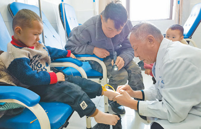哈萨克族小男孩阿尔斯·木拉力汗坐在输液室的椅子上,紧紧盯着李琳手中的针头。熟练地固定好针头后,李琳微笑着鼓励他,“你真棒,很勇敢!”