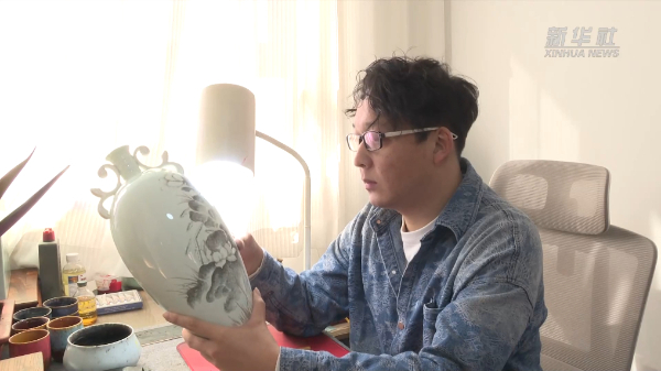在山东省淄博市淄川区的津丞艺术工作室,刘津丞正手持刻刀和小锤在一件双耳如意瓶上创作。清脆的敲击声中,一幅荷塘游鱼图逐渐呈现在瓶身上。1994年出生的刘津丞是淄博刻瓷技艺传承人。19岁那年,他拜刻瓷大师李秋峰为师,开始系统学习刻瓷技艺,并将学校里所学的油画知识融入到日常创作中。