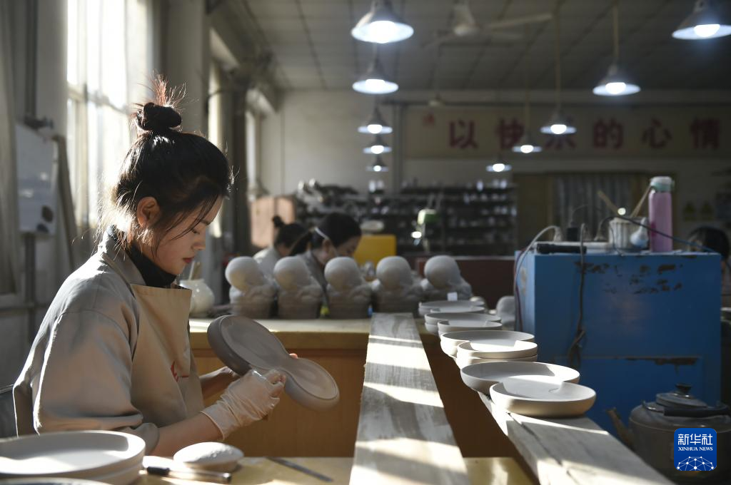 工作人员在河北省曲阳县一家定瓷生产企业的车间里加工定瓷产品。
